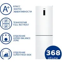 отдельностоящий, полный No Frost, электронное управление, класс A+, полезный объём: 329 л (235 + 94 л), зона свежести, перенавешиваемые двери, лоток для яиц, 59.5x66x196.8 см, белый